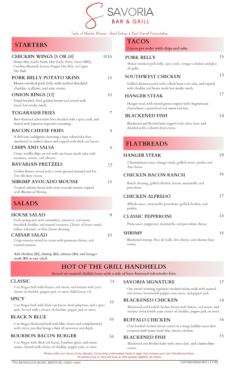 Welcome to Savoria Bar & Grill, a culinary gem nestled in Mentor, Ohio, that promises an experience filled with flavor, warmth, and great company. Conveniently located at 7703 Reynolds Rd, Mentor, OH 44060, this restaurant invites you to savor every moment, whether you're enjoying a casual meal or celebrating a special occasion.
