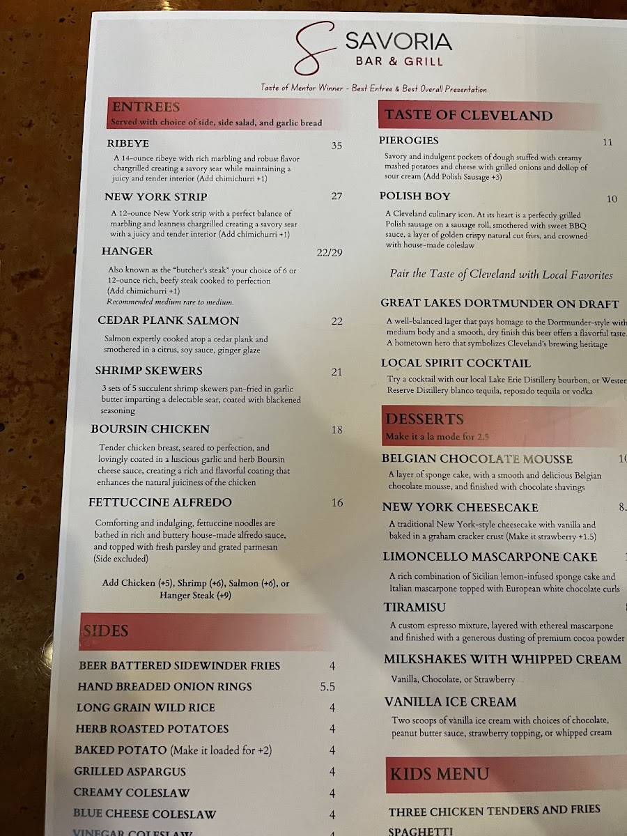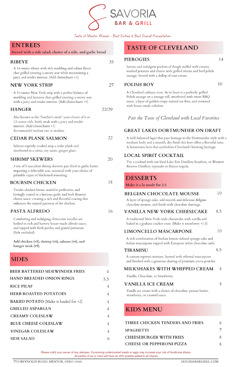 Welcome to Savoria Bar & Grill, an exquisite dining destination located at 7703 Reynolds Rd, Mentor, OH. This culinary gem offers an enticing menu that beautifully balances flavors and freshness.
